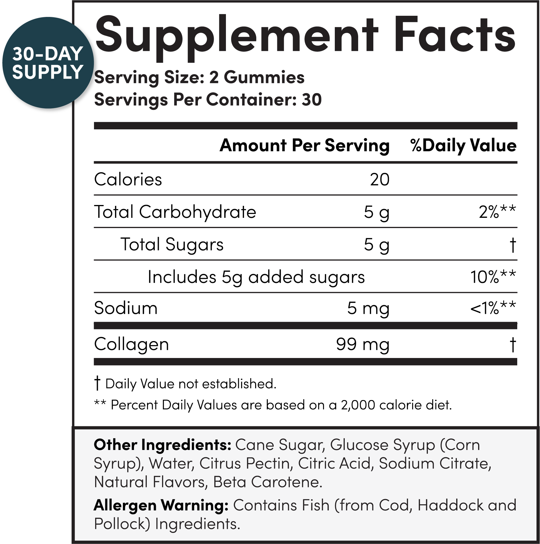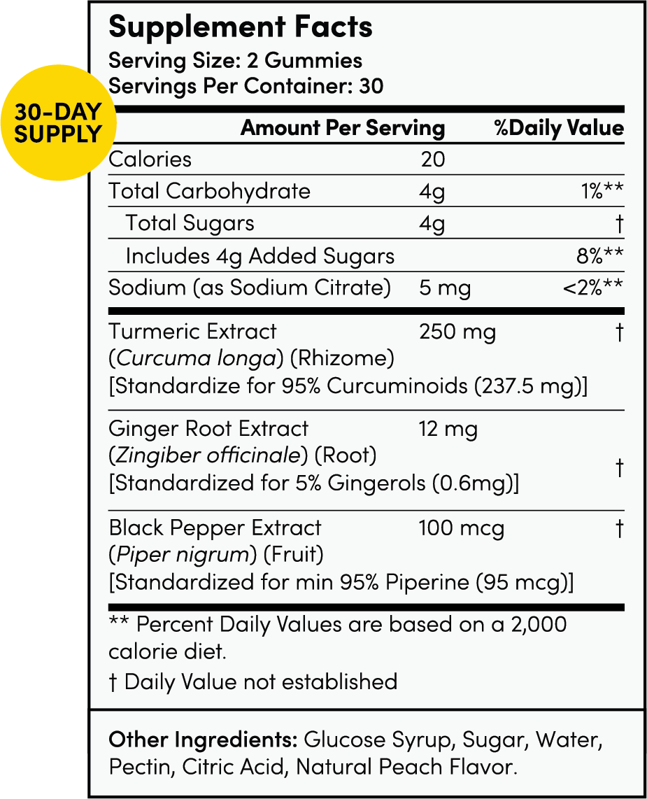 A serving is two gummies. Take one serving (two gummies) at once and chew it — it’s that easy! You can enjoy up to 8 gummies a day for Collagen, and 6 gummies per day for Turmeric & Ginger.